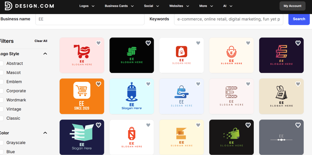 BRANDMARK: this seemed to be a very clean and simple UI (input name and adjectives), and the results were pretty good. I found one that I liked, and then noticed the ‘purchase’ button. This one is $65 one-time fee and with it you get unlimited design changes, source files and other ancillary things. Ultimately, it was hard to pull the trigger on this one because it was so basic. It was just the “EE” letters in a specific font, that I could probably find off the shelf somewhere.