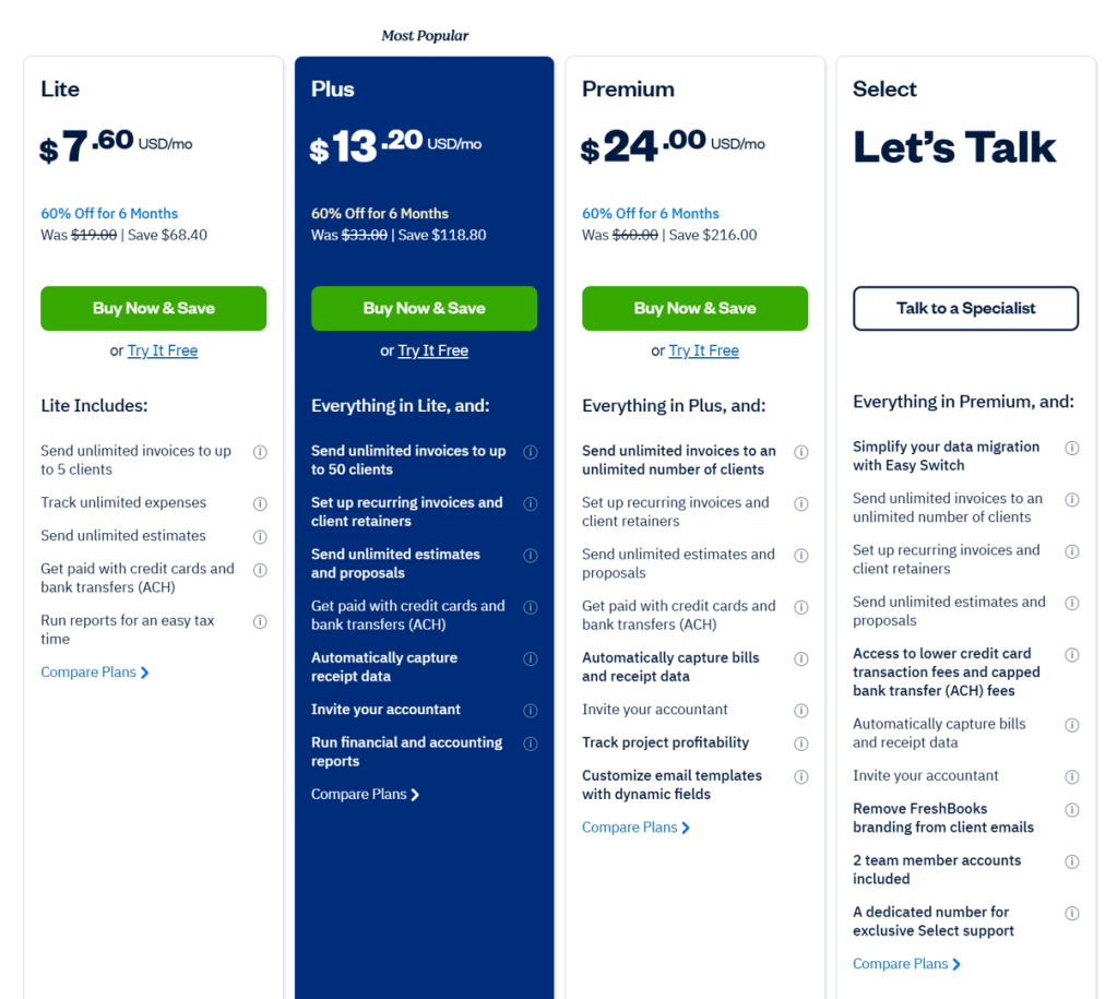 Each provide their delineated list of features and benefits in their pricing. Here’s Fresh Books: