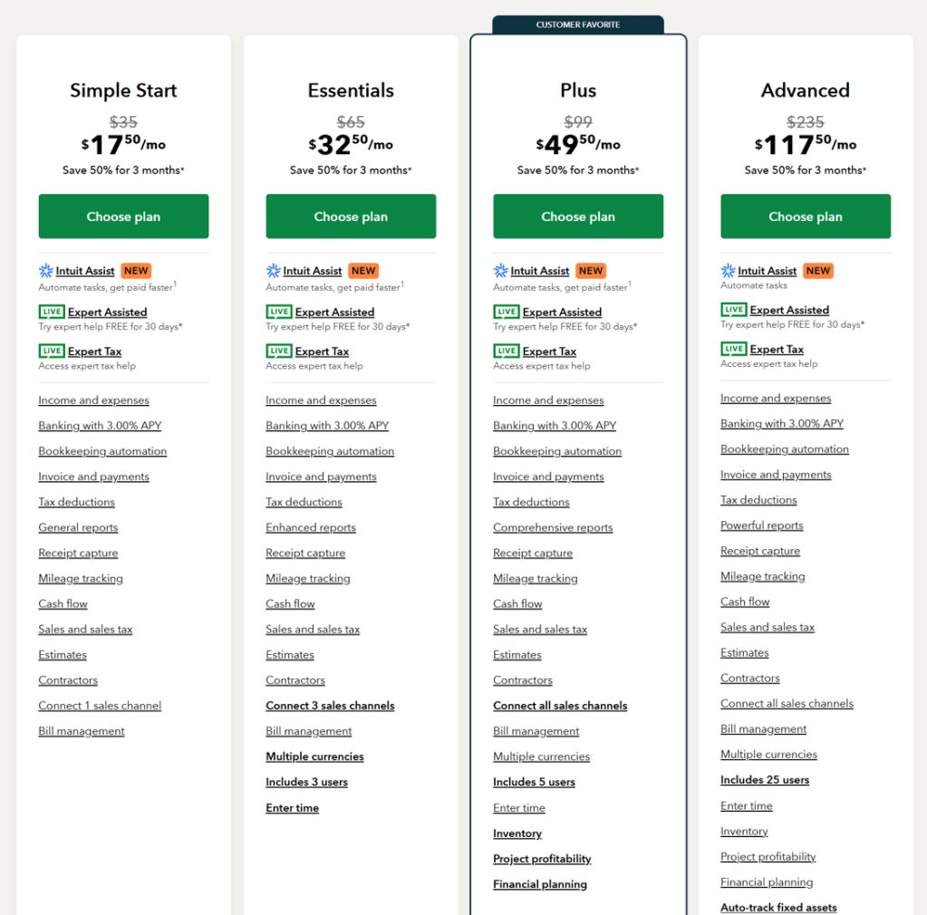At first glance, my eye goes immediately to the left to see what the cheapest plan is and if it meets my needs. I also need to consider the state of each company. Fresh Books is kind of a start up, which means some of the aforementioned risk; whereas Quickbooks has been around for decades so we know there’s no concern there. Additionally, I need to think about longer term as we scale; can the service scale with my business? Clearly you get what you pay for. QB’s plans are more expensive, but do seem more robust in their offering. FB’s plans are lower but more limited in capabilities.